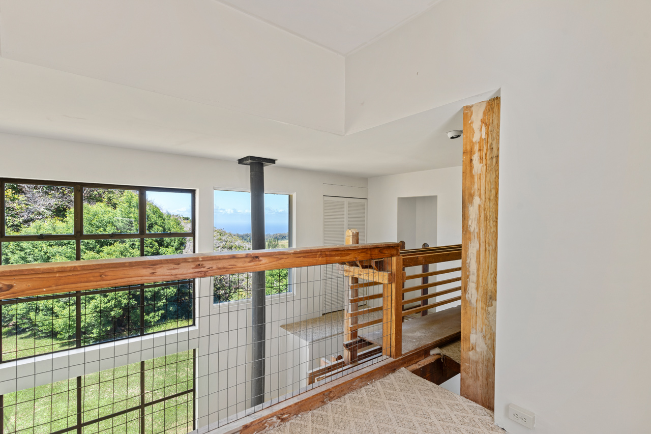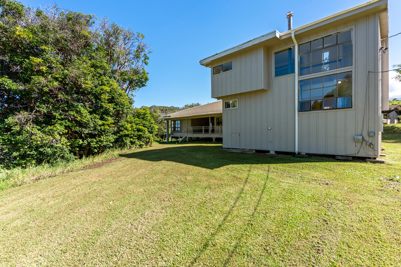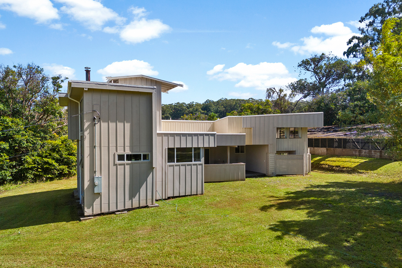 Crafted by renowned local architect Don Bernshouse, this architectural gem is truly one of a kind. Nestled on two acres of pristine land, this property boasts dramatic ocean and gulch views. The 3-bedroom, 3-bathroom home offers 2,471 square feet of thoughtfully designed living space. This unique property is artfully divided into three distinct areas, seamlessly connected by covered breezeways. Each section provides its own sense of privacy and purpose, perfect for family living or entertaining guests. Enjoy the flow of indoor-outdoor living while surrounded by beautiful landscaping. The expansive grounds include a pickleball court, perfect for outdoor recreation, and a greenhouse structure that awaits your creative vision for rebuilding. With catchment water systems in place, you can enjoy sustainable living in this idyllic setting. The flat terrain on the Mauka side of the property has a separate access off of Awalau Road and offers the ideal place for adding an Ohana or guest house. Embrace the potential of this unique property, where creativity meets nature in a harmonious blend.